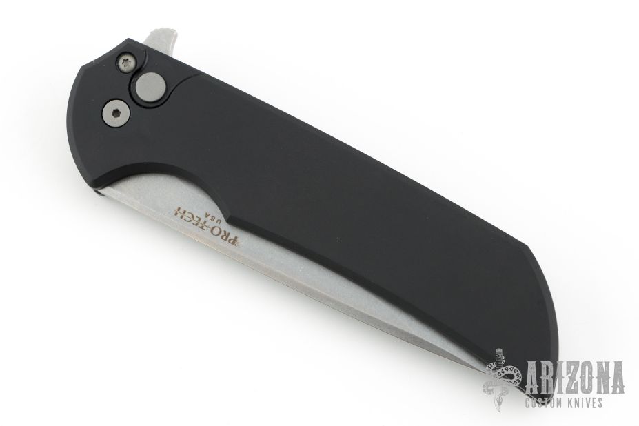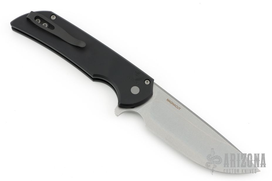 This Mordax by Pro-Tech is a Ferrum Forge design and features a stonewashed drop point blade. The handle has a black aluminum frame with black tip up stainless steel clip. Comes with original box, pouch and papers. Excellent condition.