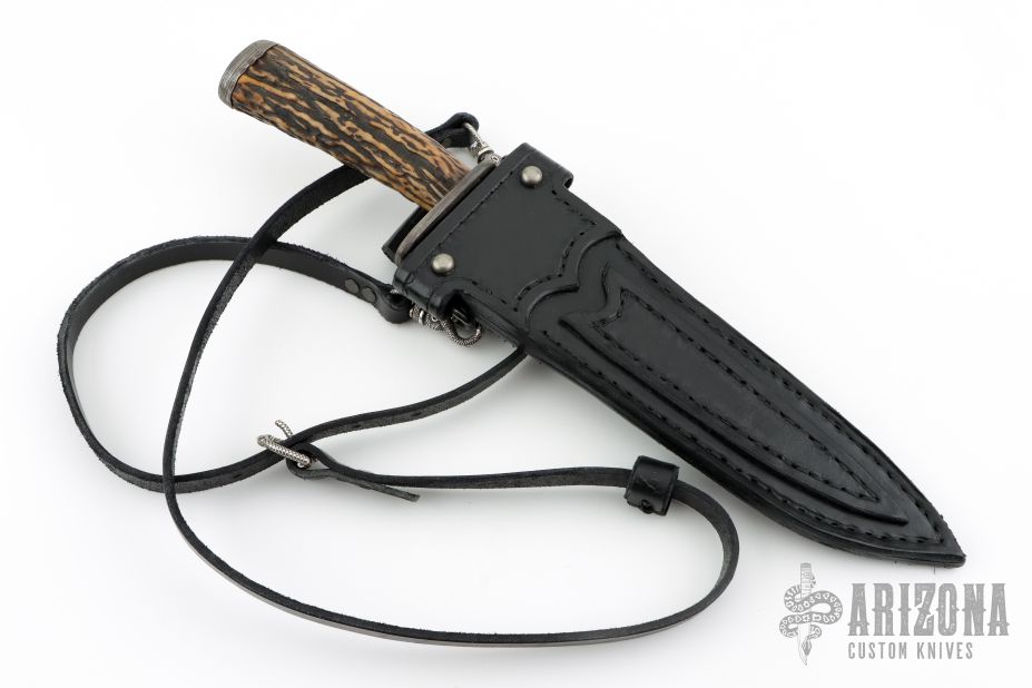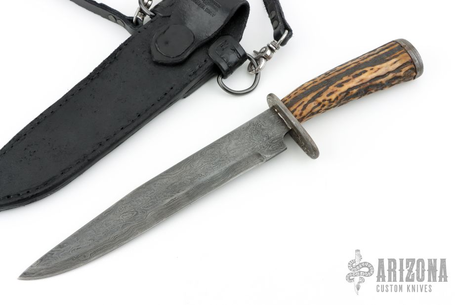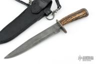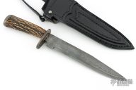 This Bowie by Michael D Scott features a Damascus blade with .145" blade stock and 1.405" blade depth, hidden tang construction. The handle has a Damascus guard and butt with a stag grip. Comes with a black leather sheath with a shoulder rig. Excellent condition.