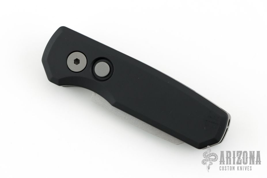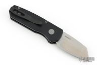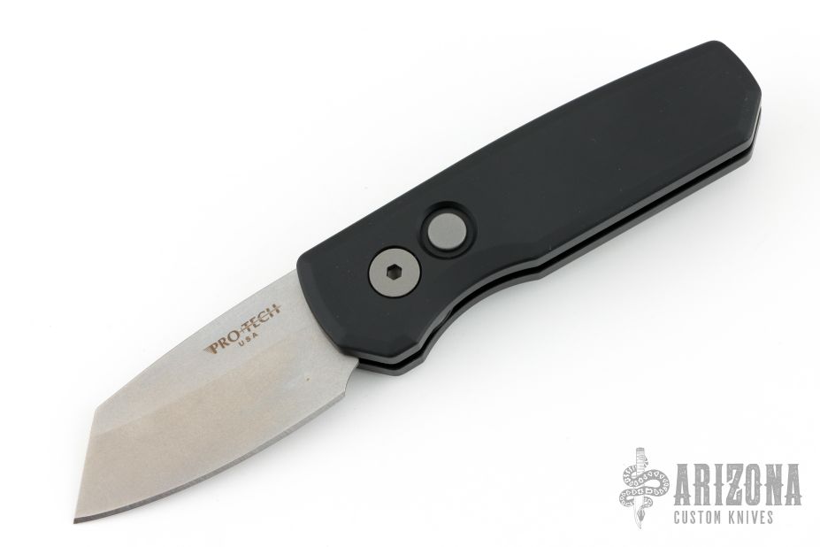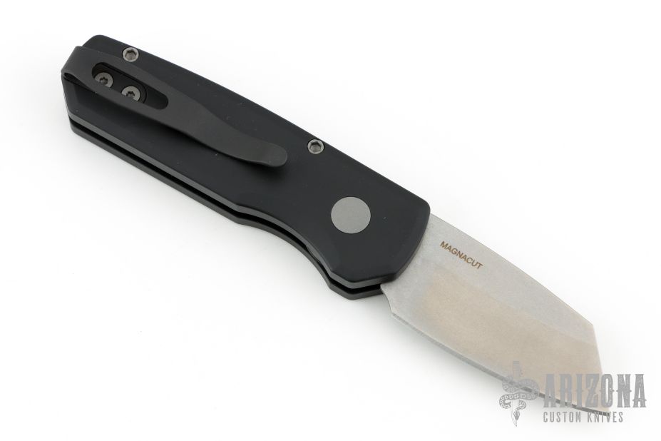 This Runt by Pro-Tech features a stonewashed Magnacut blade. The handle features a black aluminum frame with milled thumbrest, a bead blasted push button and black stainless steel tip up pocket clip. Comes with original box, pouch, and papers. Excellent condition.