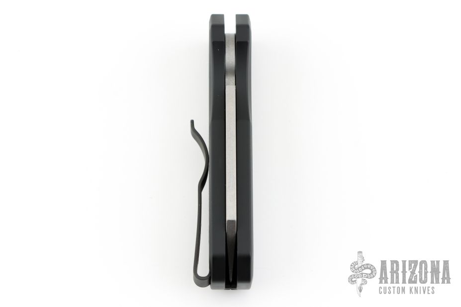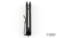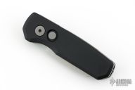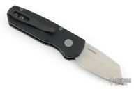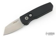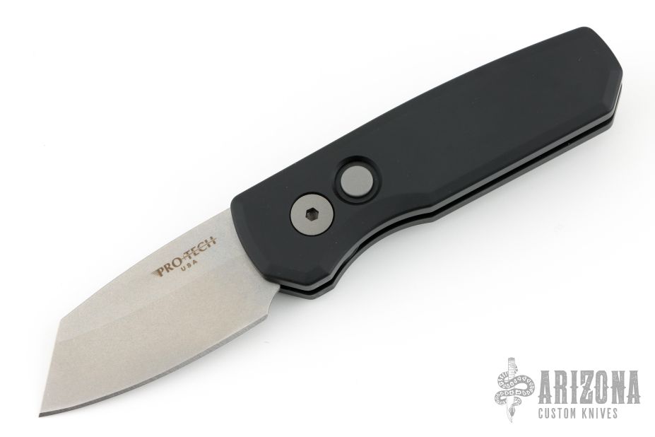 This Runt by Pro-Tech features a stonewashed Magnacut blade. The handle features a black aluminum frame with milled thumbrest, a bead blasted push button and black stainless steel tip up pocket clip. Comes with original box, pouch, and papers. Excellent condition.