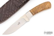 This hunter by Arno Bernard features a hand rub satin finish drop point blade, .143" blade stock and 1.120" blade depth, full tapered tang construction. The handle has satin finished stainless steel bolsters, and curly maple scales. Includes a brown leather sheath. Has some light scuffs and scratches, good condition otherwise.
