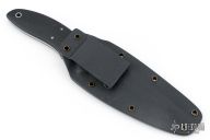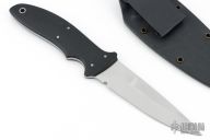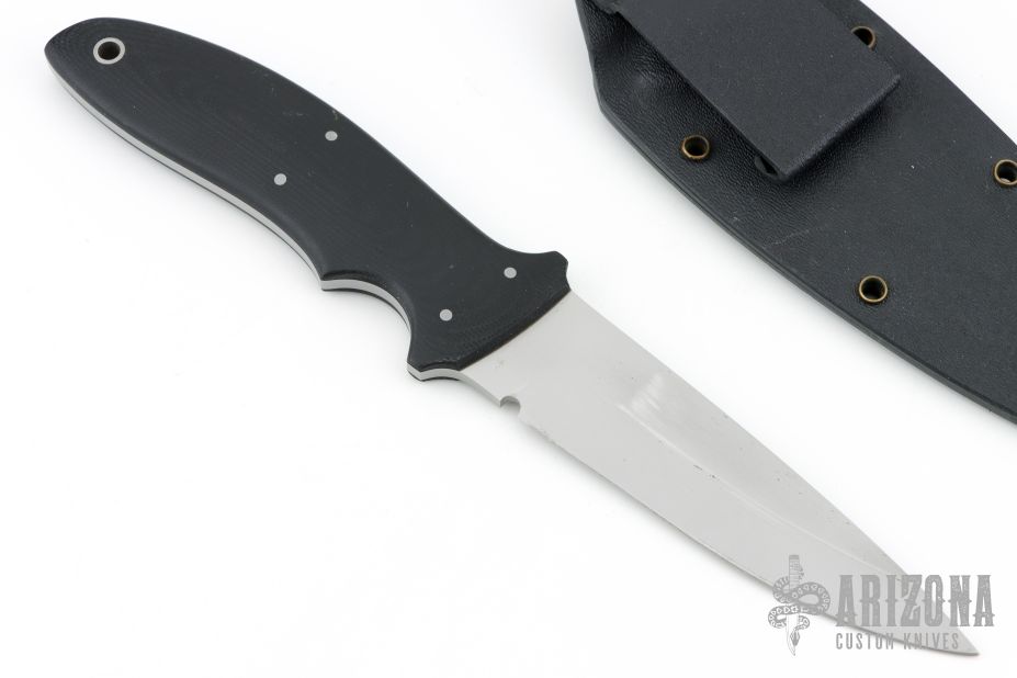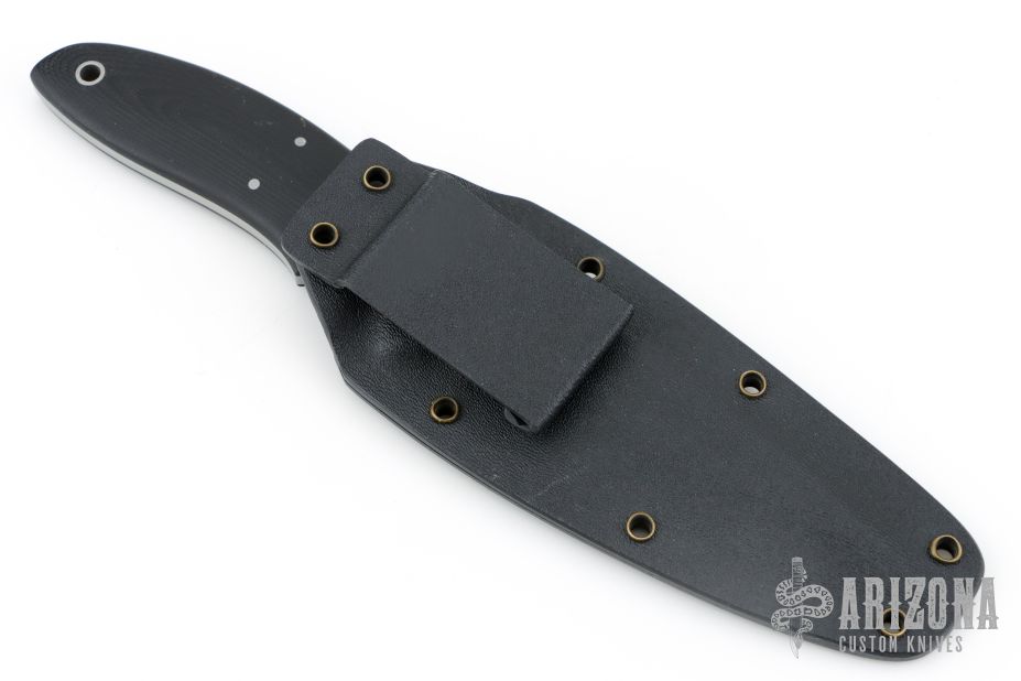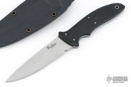 This Polecat by Al Polkowski features a drop point bead blasted blade with .133" blade stock and 1.069" blade depth, full tang construction with black G10 scales and bead blasted stainless steel pins and lanyard hole. Comes with kydex sheath with belt clip. Has some scuffs and scratches, great condition otherwise.