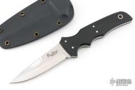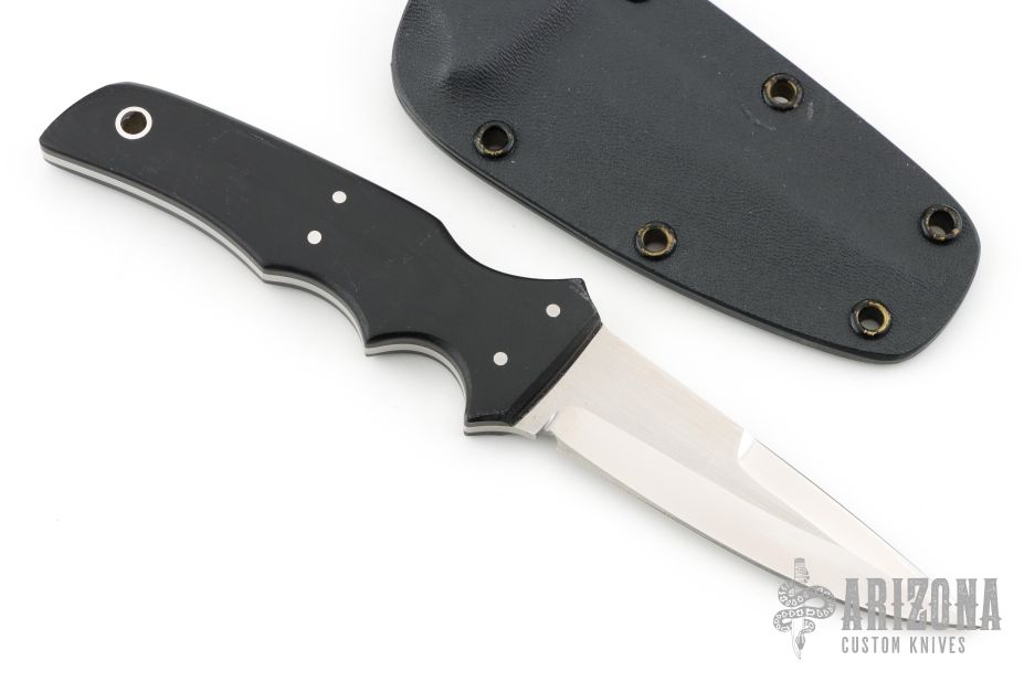 This Wasp by Al Polkowski features a spear point blade with satin finish, false top edge, .124" blade stock and .912" blade depth, full tang construction with black G10 scales and bead blasted stainless steel pins and lanyard hole. Comes with kydex sheath. Has some scuffs and scratches, great condition otherwise.