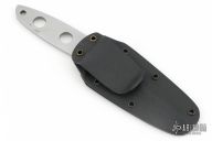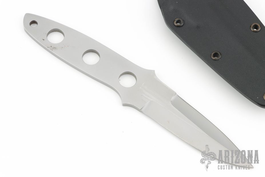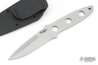This boot knife by Al Polkowski has a bead blast finished blade with thumb ramp, top edge, .165" blade thickness and 1.091" blade depth, full tang construction. Comes with a kydex sheath with clip. Has some scuffs and scratches, excellent condition otherwise.