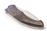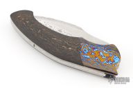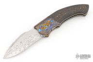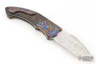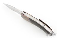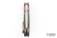 This Utopia Bolster Flipper by Stefano Nardelli features a Damasteel blade with polished bevels and satin finished flats, false top edge. The handle has Chad Nichols MokuTi bolsters, copper carbon fiber scales, satin finished titanium liners with anodized and jeweled interiors, Damasteel backspacer, tip up Chad Nichols MokuTi clip with hidden screws. To flip the blade open, pull back on the top of the clip side bolster. The unlock the blade, push the button under the front side bolster. Nice lockup and blade seating. Comes with original box, zippered case with extra parts and screws, and a COA dated 03/2020. This one is #1 and it is marked under the bolster. Excellent condition.