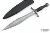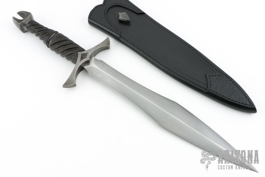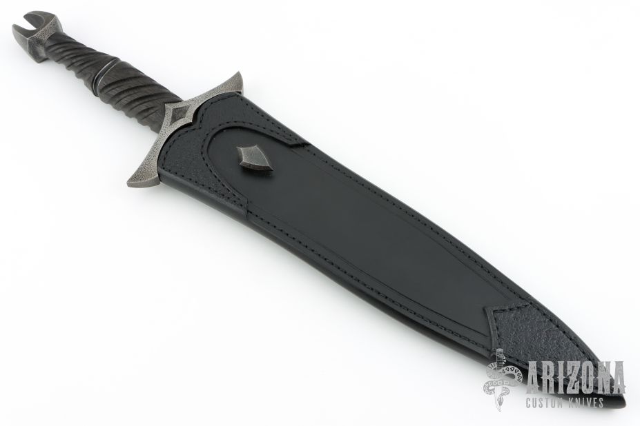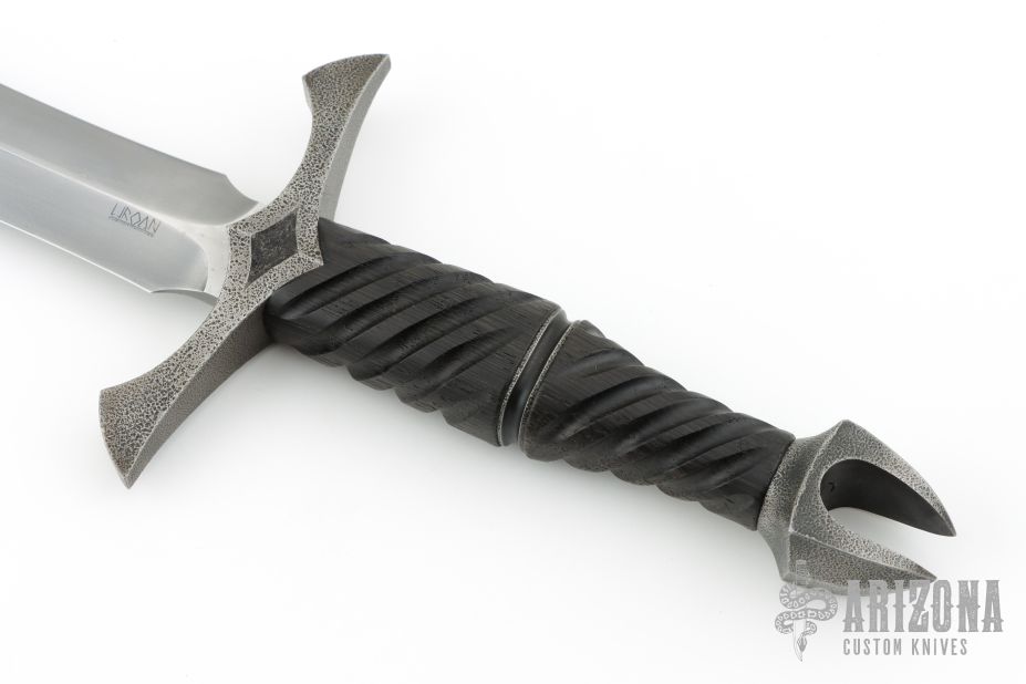 This Azrael by Wroan Custom Knives features a hand rub satin finished double edged blade with .245" blade stock and 1.940" blade depth, hidden tang construction. The handle has a antiqued mile steel guard, fluted spacer and butt, spiral fluted oak oak grip. Comes with a hand tooled black leather sheath with an antiqued mild steel belt stud, and a COA dated 10-17-2024. New from maker!