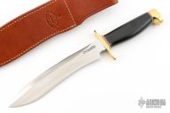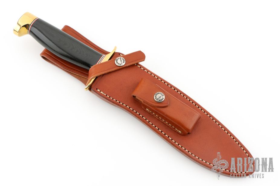 This Small Sasquatch by Randall Made Knives features a satin finished recurve blade with sharpened top edge, .243" blade stock and 1.319" blade depth, hidden tang construction. The handle has a brass double guard and crows beak butt, black linen micarta grip with red/white/blue spacers. Comes with a brown leather sheath and a Randall zippered case. Excellent condition.