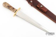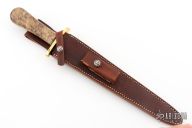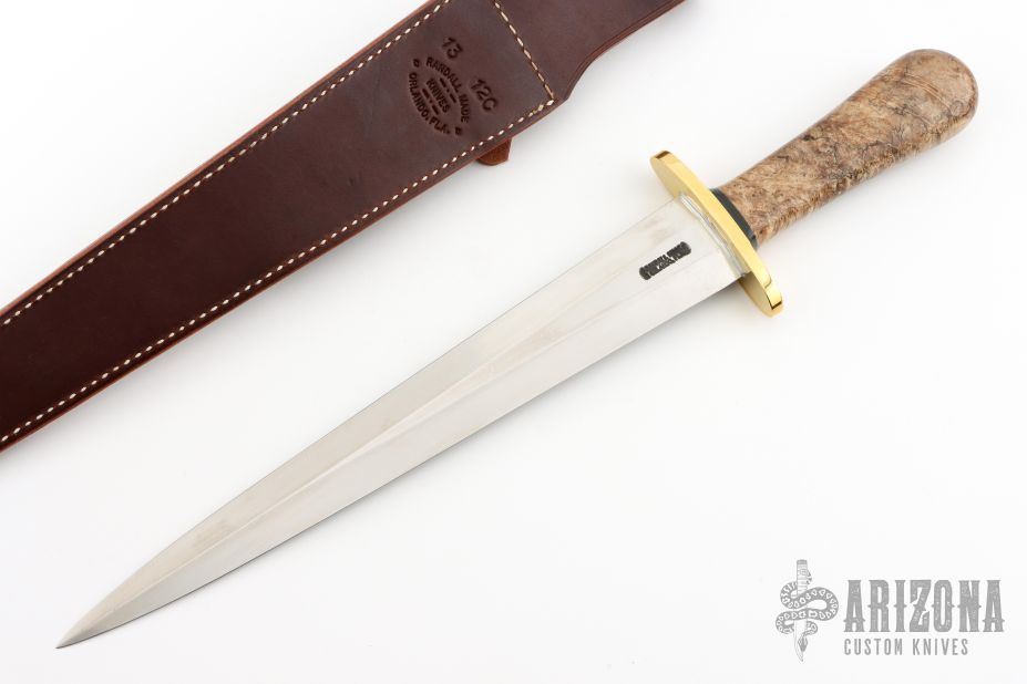 This Model 13-12 Arkansas Toothpick by Randall Made Knives features a satin finished carbon steel double edged blade with .197" blade stock and 1.712" blade depth, hidden tang construction. The handle has a forward curved brass guard, spalted maple burl grip with black spacers. Comes with a brown leather sheath, original paper wrapping and a zippered case. Excellent condition.