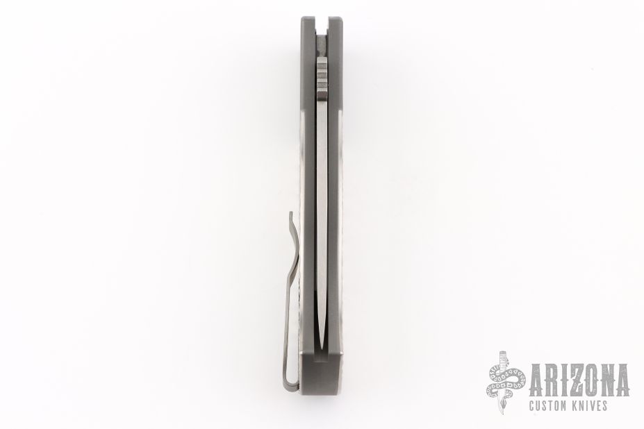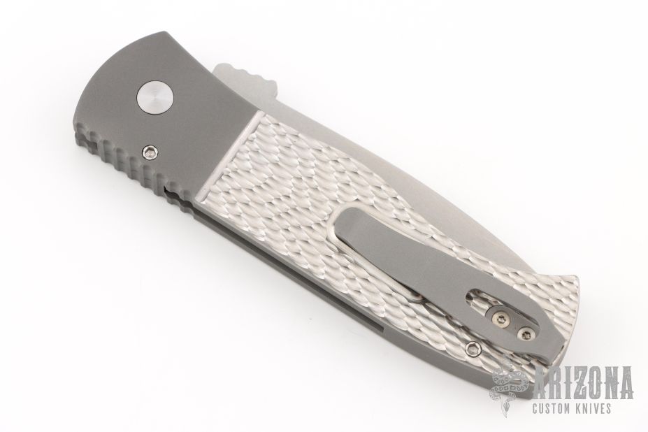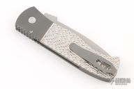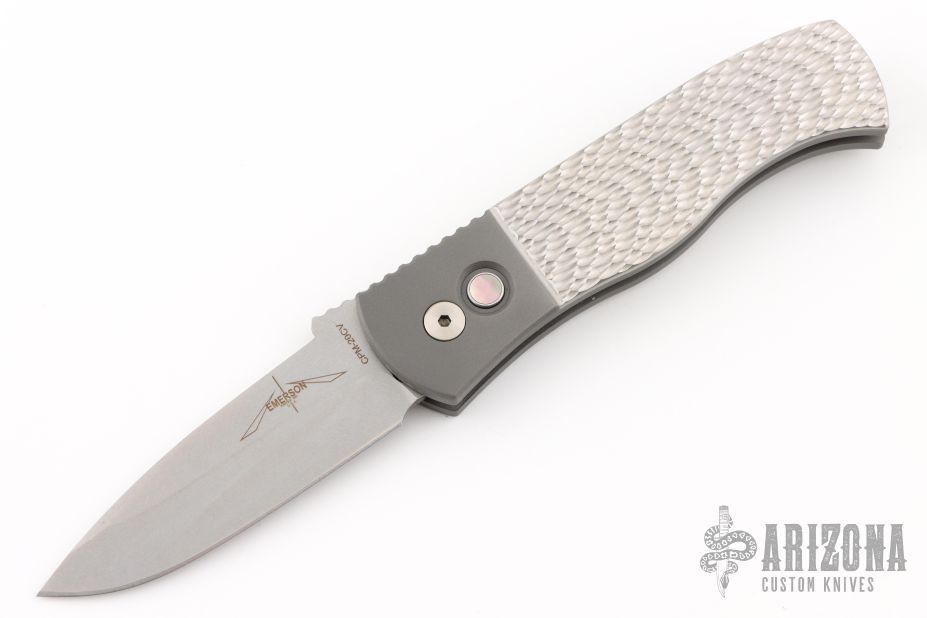 This Emerson/Pro-Tech CQC7 automatic has a stonewashed blade and a two-tone Monochrome jigged titanium handle with black lip pearl inlaid push button. Stainless steel clip, tip up carry. Coil spring. Comes with original box and papers. Excellent condition.
