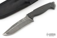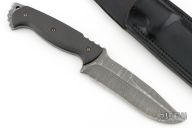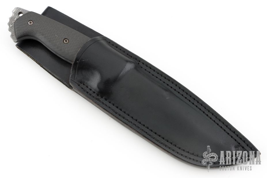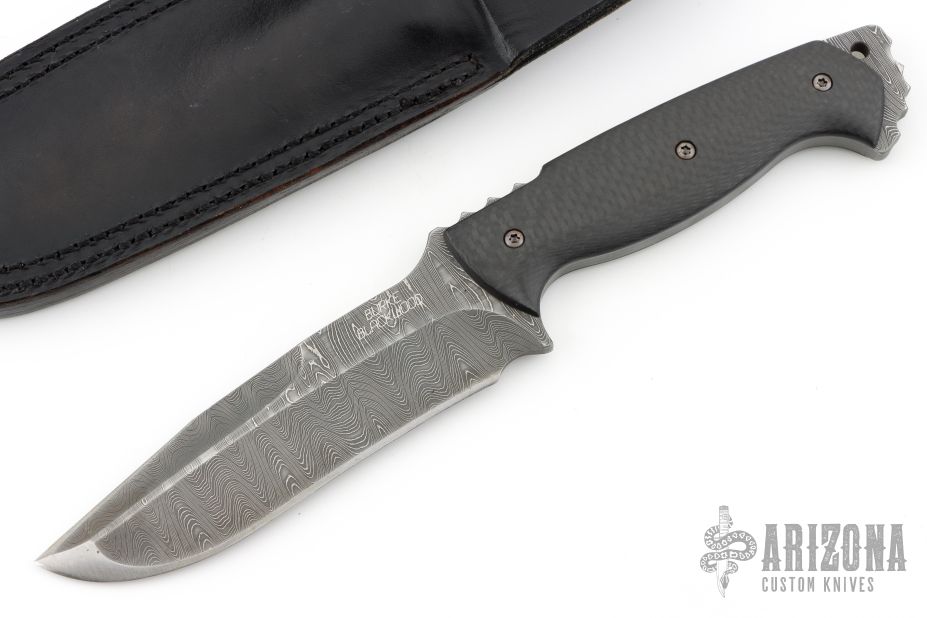 This knife by Jim Burke and Neil Blackwood features a Damascus blade with a sharpened top edge and notched thumbrest, .226" blade stock and 1.384" blade depth, full tang construction. The handle has carbon fiber scales and a lanyard hole at the butt. Comes with a black leather sheath. Excellent condition.