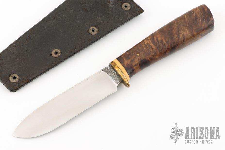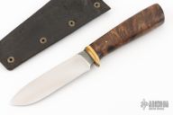 This knife features a satin finished blade with .118" blade stock and 1.079" blade depth, hidden tang construction. The handle has a brass guard, walnut grip with brass pin and an ivory paper micarta spacer. Comes with a brown leather sheath. Excellent condition.