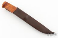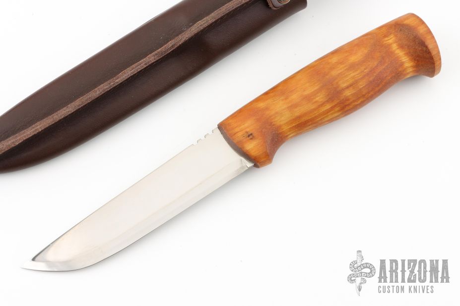 5″ triple laminated stainless steel drop point blade with a curly birch handle. Includes leather belt sheath. Overall length: 9⅞”