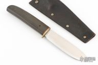 This knife features a satin finished blade with .112" blade stock and 1.129" blade depth, hidden tang construction. The handle has a brass guard, green canvas micarta grip with brass pin and a red spacer. Comes with a brown leather sheath. Has a couple light scratches, otherwise excellent condition.