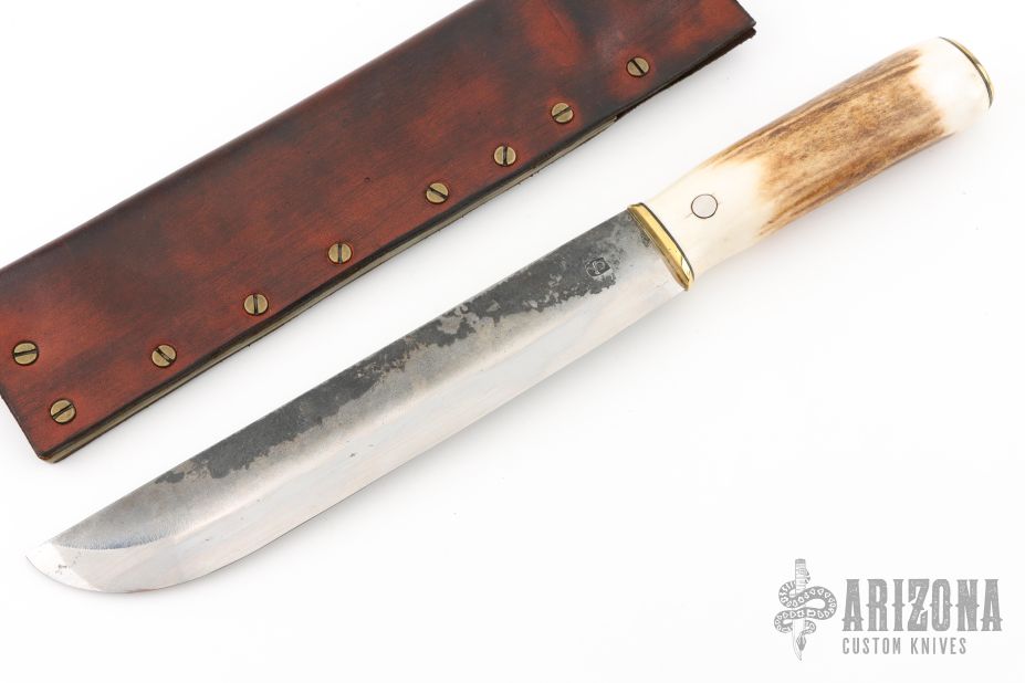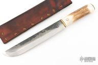 This Hand Crafted Nordic Leuku was forged by Yrjö Puronvarsi and designed by Antti Mäkinen, it features a carbon steel blade with polished bevels and forge finished flats, .196" blade stock and 1.515" blade depth, hidden tang construction. The handle has a brass guard and butt, high density Finnish reindeer antler grip with black spacers. Comes with a brown leather sheath. Has a couple light scratches, otherwise excellent condition.