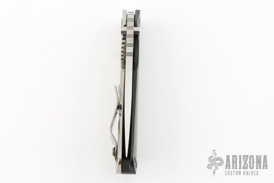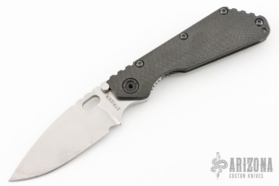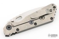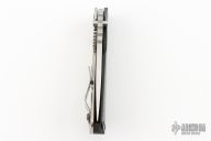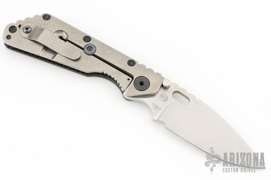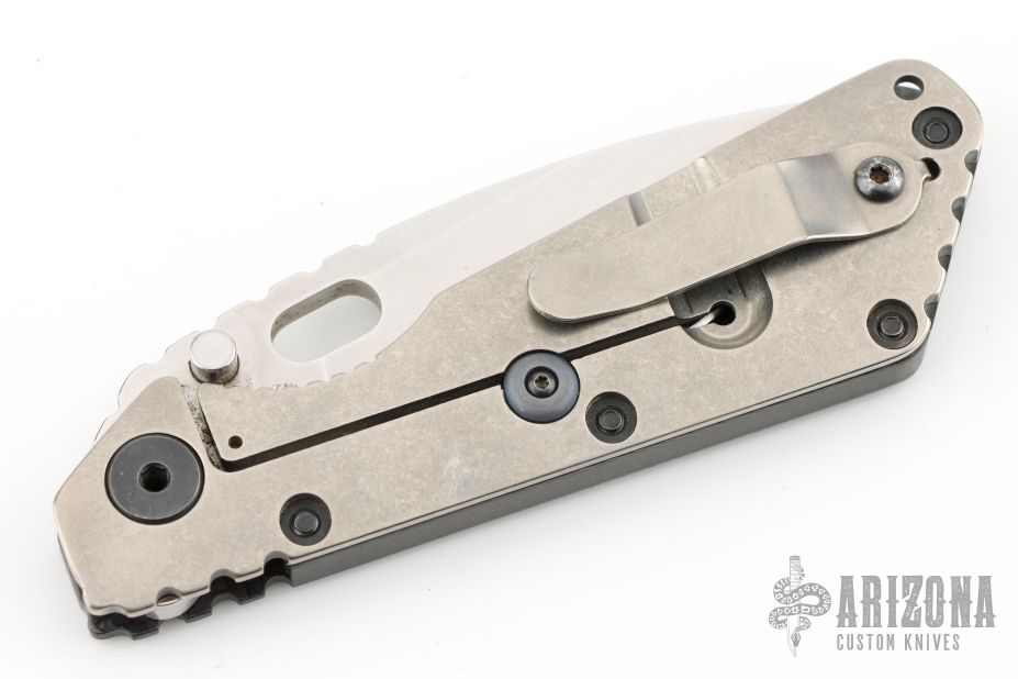 This SMF CC by Strider Knives features a stonewashed blade and smooth carbon fiber and a stonewashed titanium handle and matching tip up titanium clip. Notches on thumbrest, rear of handle, and early lockup. Includes Hinderer "Lock Bar Stabilizer" for maximum reverse lock retention. Has a couple light scratches, otherwise excellent condition.