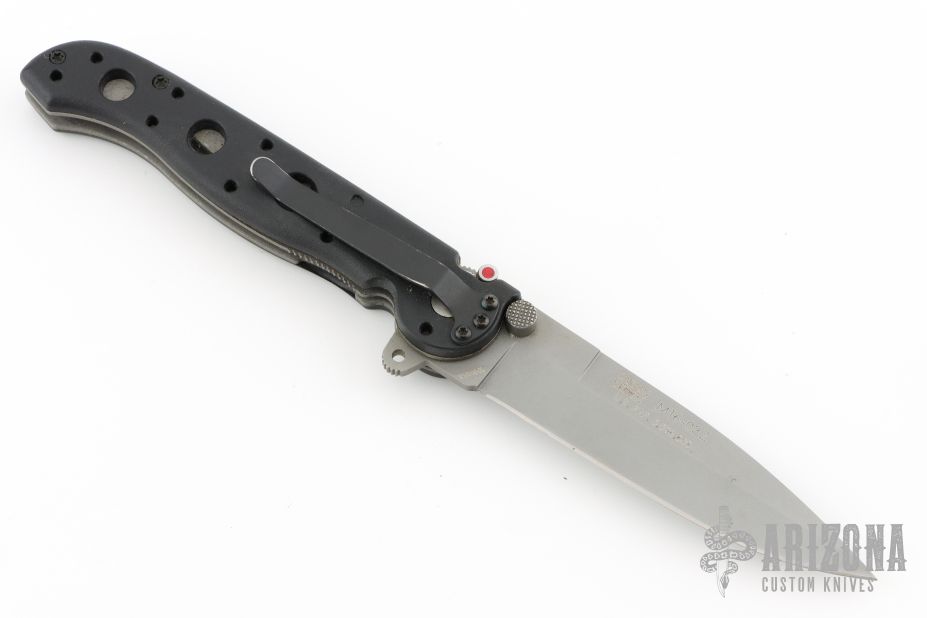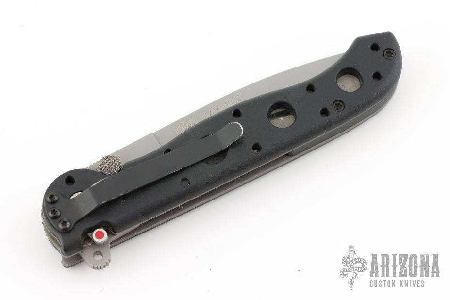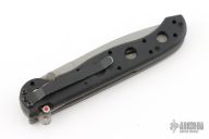 This M16 from CRKT features a bead blasted spear point blade with dual thumbstud and a flipper. The handle has black FRN scales over titanium liners and a black tip down pocket clip. Has some light scuffs, otherwise good condition.