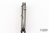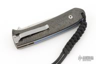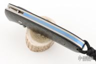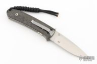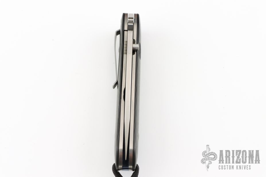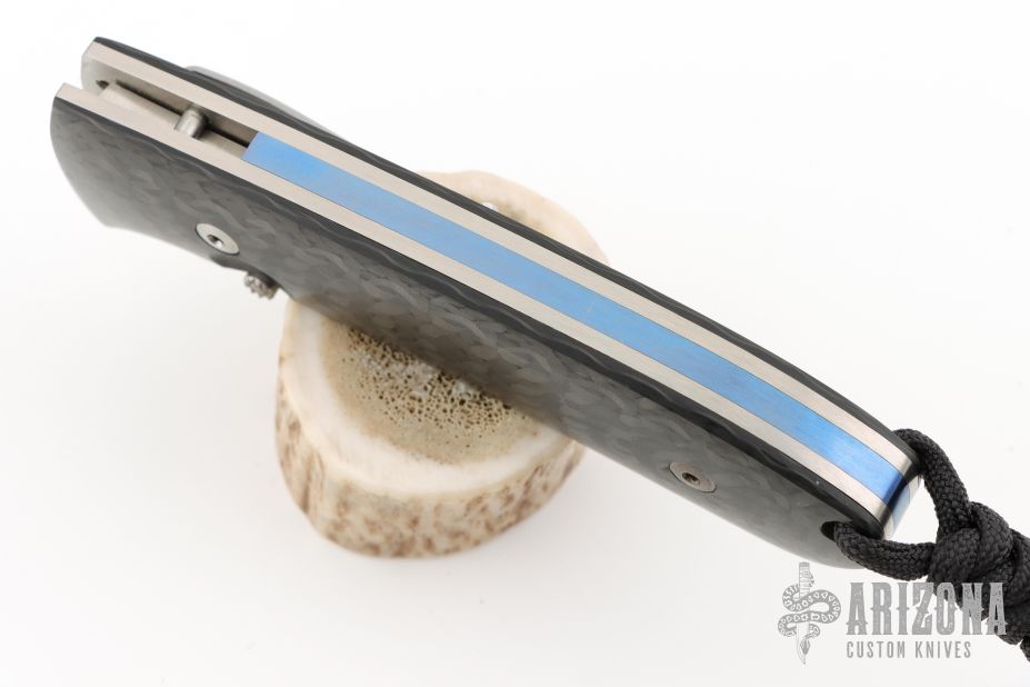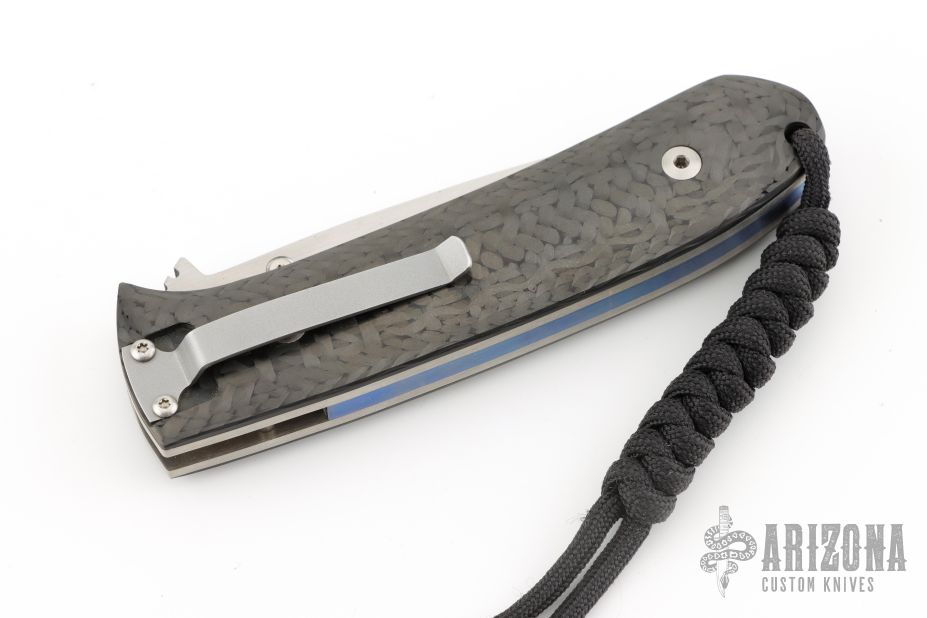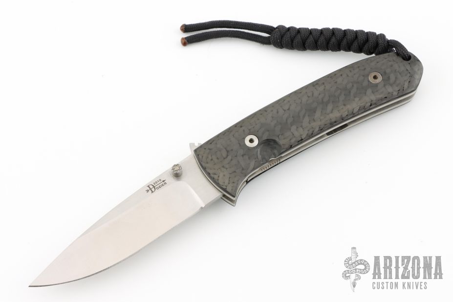 This linerlock folder by Dozier Knives has a satin finished blade with notched thumbrest and single thumbstud. The handle has carbon fiber scales, titanium liners and backspacer, tip down titanium clip. Excellent Condition.