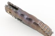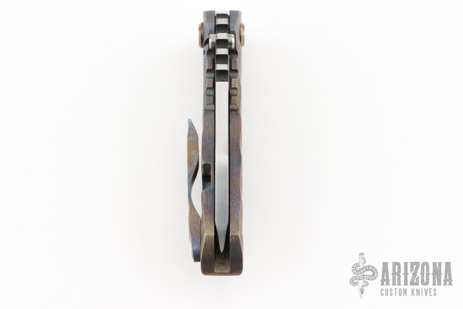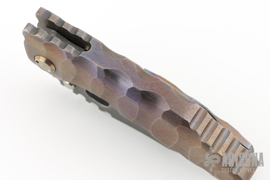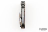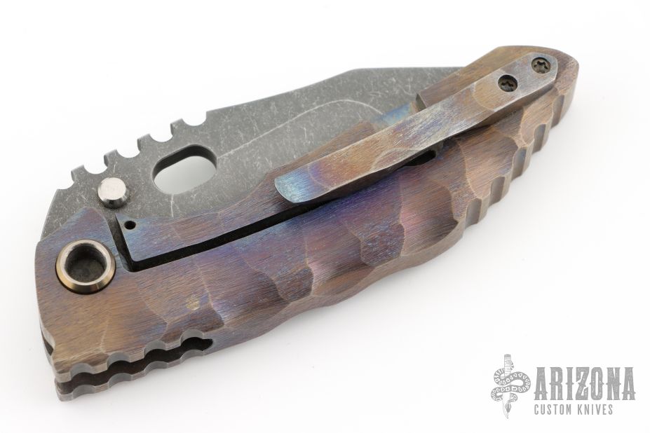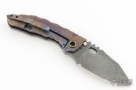 This Draco from Dalibor Bergam features an acid/tumble finished multi-ground blade with notched thumbrest and thumbhole. The handle has a sculpted, heat-colored integral titanium frame with a matching pocket clip positioned for tip up carry. The blade is centered when closed, opens/closes smoothly, and locks up with absolutely no play. Excellent condition.