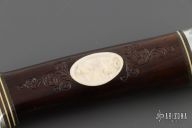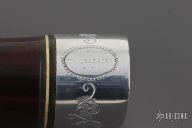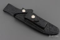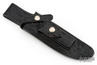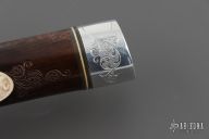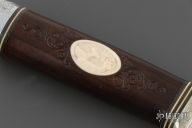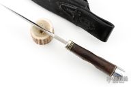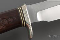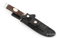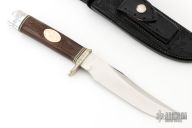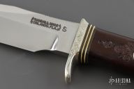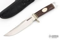 This Model 12-6 Little Bear Bowie from Randall Made Knives features a satin finished blade with a nearly sharpened top edge and notched thumb rest, .246" blade stock and 1.136" blade depth, hidden tang construction. The handle has a nickel silver guard and duralumin butt, wood grip, white/blue spacers. Has engraving on the guard, grip and butt. Carved ivory inlays on both sides with two animals each - typically these have one animal per inlay. Singed and dated on the butt, 5/71. Hand-tooled leather sheath included. Has some patina. Excellent condition.
