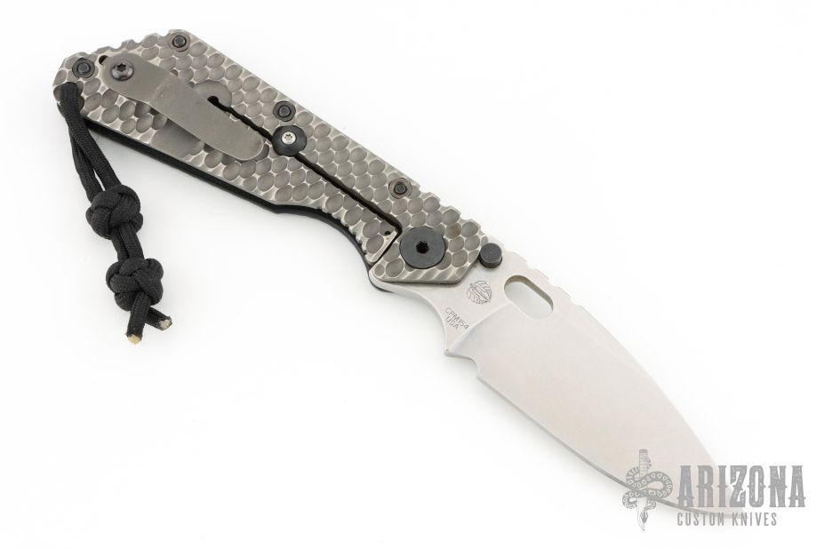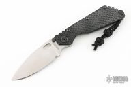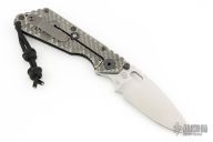 This SMF DGG by Strider has a stonewash spear point blade with dual thumbstuds, thumbhole, and a notched thumbrest. Handle is black G-10 and bead blasted titanium "Gunner Grip", lockbar stabilizer, and titanium tip up clip. Nice detent, lockup and blade seating. Has some light scuffs on the clip, otherwise excellent condition.