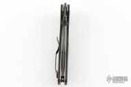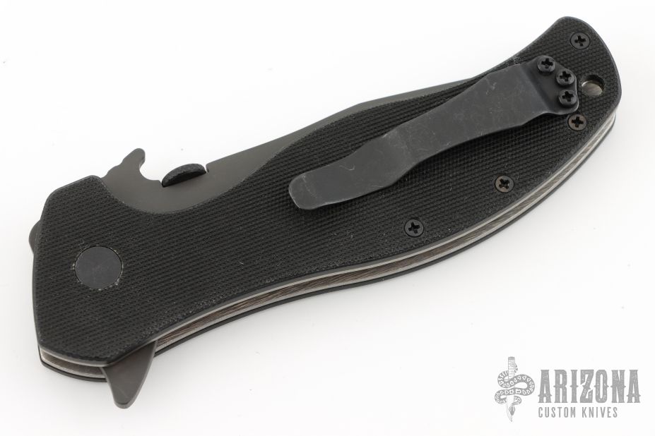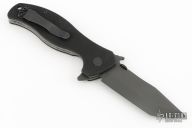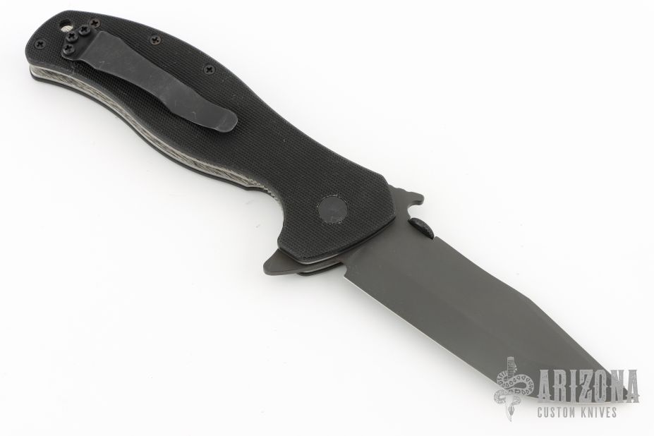 This Sig "Legion" by Emerson Knives features a black coated tanto blade with swedge, knurled thumb disc, wave feature and flipper. The handle is comprised of black G10 scales over titanium liners and black standoffs. Black coated tip up clip and lanyard hole in pommel. This knife is a limited edition and is #120, it was made exclusively for Sig Sauer Legion Members. Has a couple light scuffs, otherwise excellent condition.