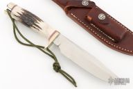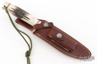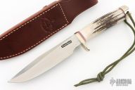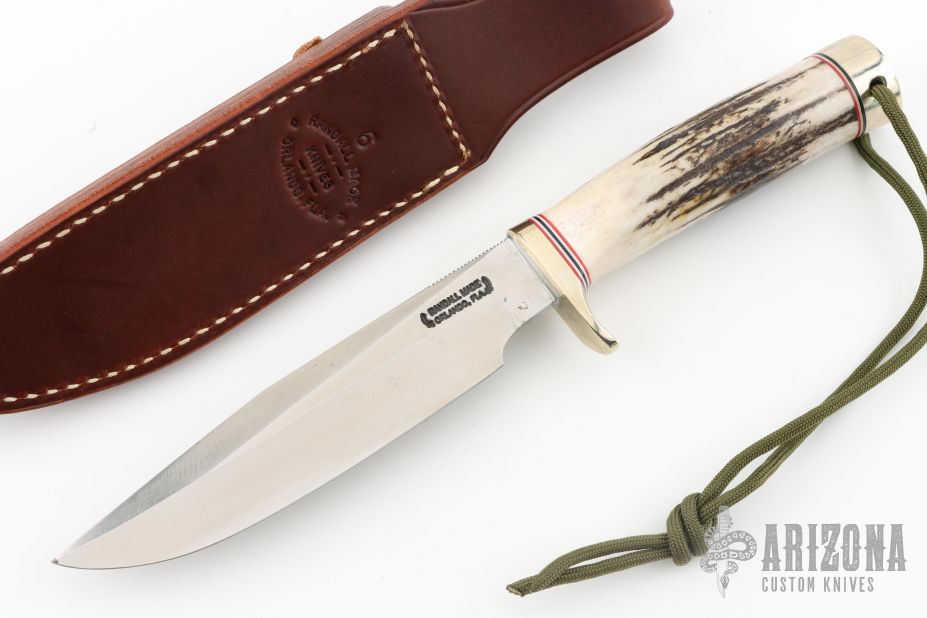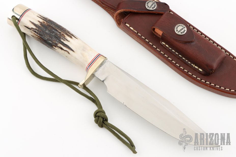 This Model 5 Camp and Trail Knife by Randall Made Knives features a satin finished blade with false top edge and notched thumbrest, .215" blade stock and 1.264" blade depth, hidden tang construction. The handle has a nickel silver guard and butt with lanyard hole, stag grip with red/white/blue spacers. Comes with a brown leather sheath, zippered case and original paper wrapping. Has a couple small oxidation spots, otherwise excellent condition.