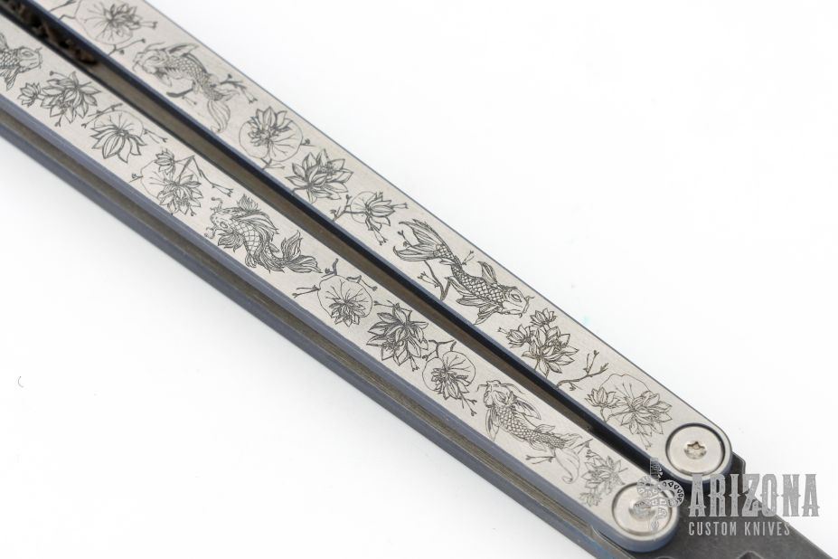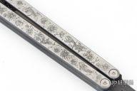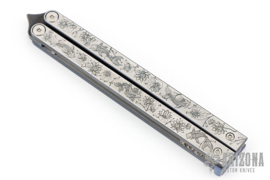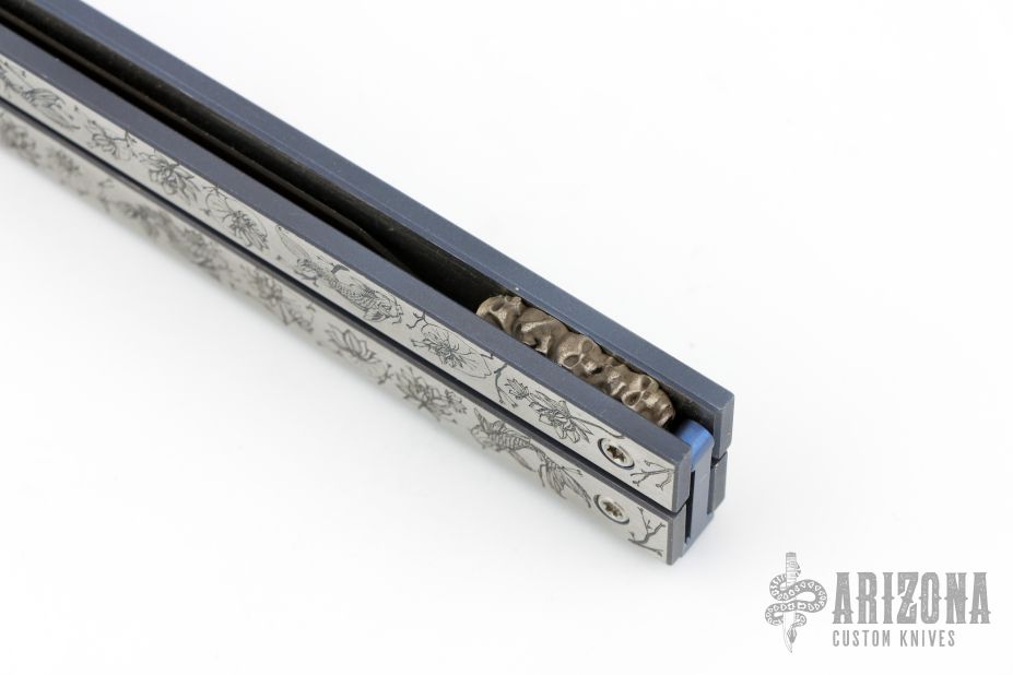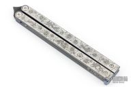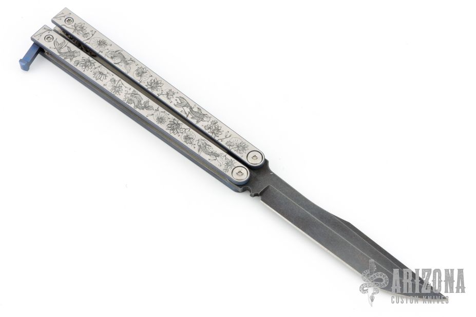 The Michael Zieba Balisong is a custom butterfly knife available at a production price point. It features his trademark harpoon drop point spine profile with a tanto cutting edge so that it will fit into the slender frame.The titanium handles bead blast finished with laser engraving and silver skull spacers. The bearing pivots lead to very smooth flipping action and its proper balance allows you to perform any trick you're daring enough to try. This butterfly knife is a fantastic representation of Mike as both a designer and a knifemaker. It's precise, stylish, different from the rest, and is both new age and classic. Handmade in the USA. Comes with a plastcic clasp case, COA, and maker's card. Excellent condition.