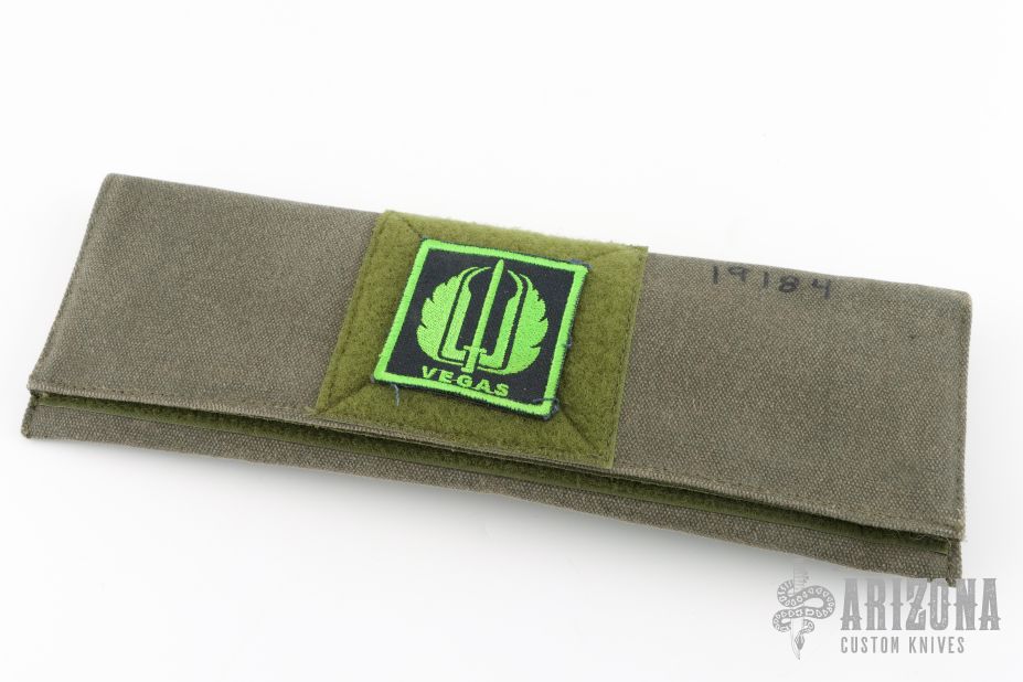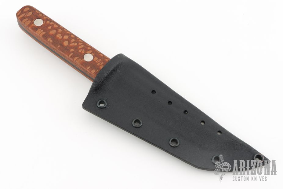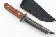 This Tanto Fighter by Duane Dwyer features a two-tone blade with fullers, .164" blade stock and 1.196" blade depth, full tang construction. The handle has a MokuTi guard, lacewood scales. Comes with a kydex sheath and a velcro case. Excellent condition.