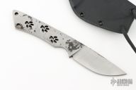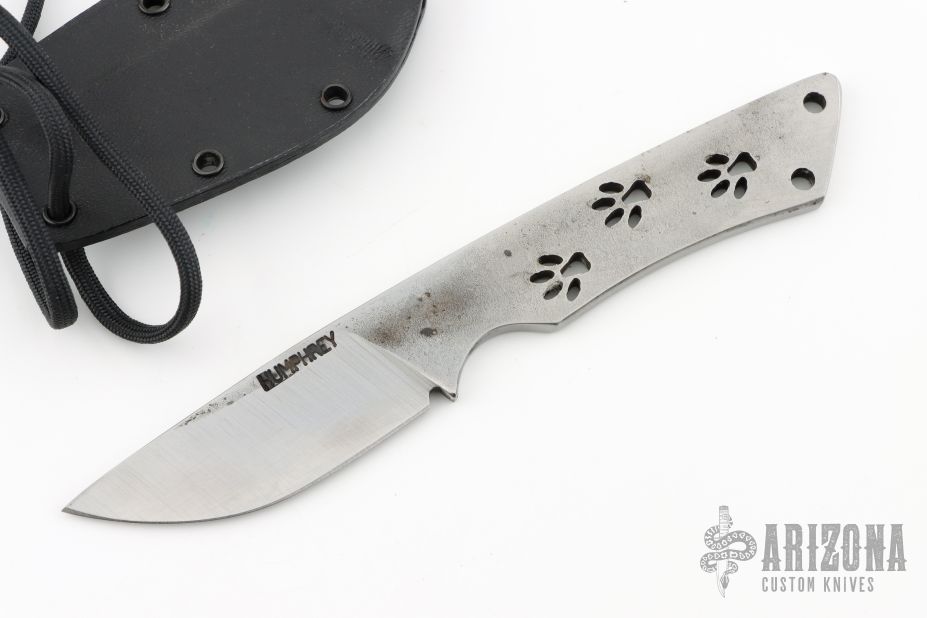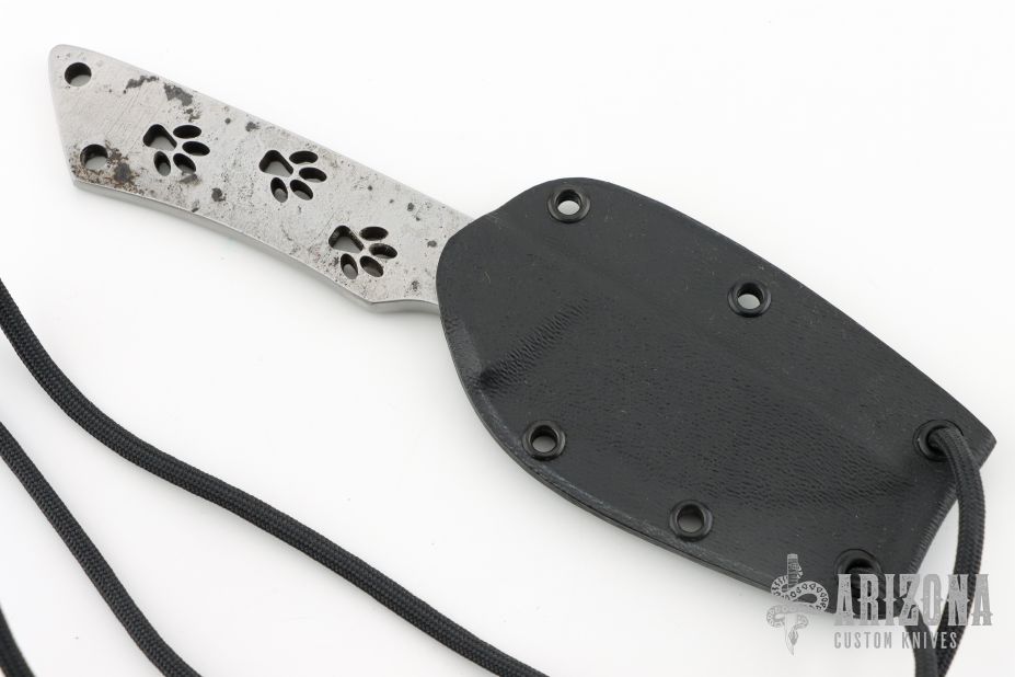 This Neck Knife by Lon Humphrey features a satin finished blade with forged finished handle, .183" blade stock and 1.025" blade depth, full tang construction. Has dog paws pierced into the tang. Comes with a Kydex neck sheath and original box. Excellent condition.
