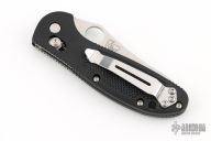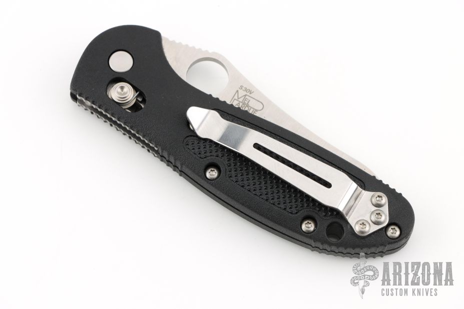 This Mel Pardue design by Benchmade has a stonewashed blade with notched thumbrest and thumbhole. Axis lock mechanism. The handle has black FRN scales, stainless steel liners and tip up reversible clip. Includes original packaging and paperwork. Excellent condition.