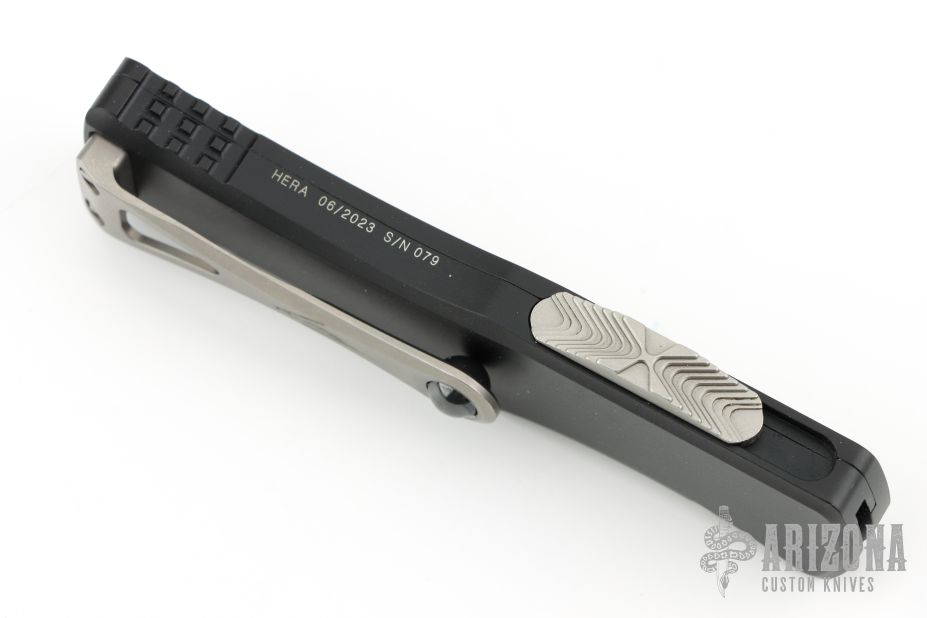 This Hera from Microtech Knives features a stonewashed Hell Hound blade with satin flats and dual fullers. The handle has a black aluminum frame with a tip down titanium clip with ceramic ball inset. Dated 06/2023 and s/n 079. Comes with original box and papers. Excellent condition.