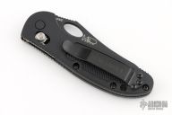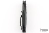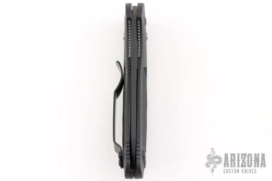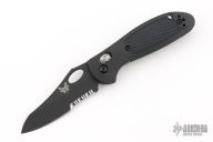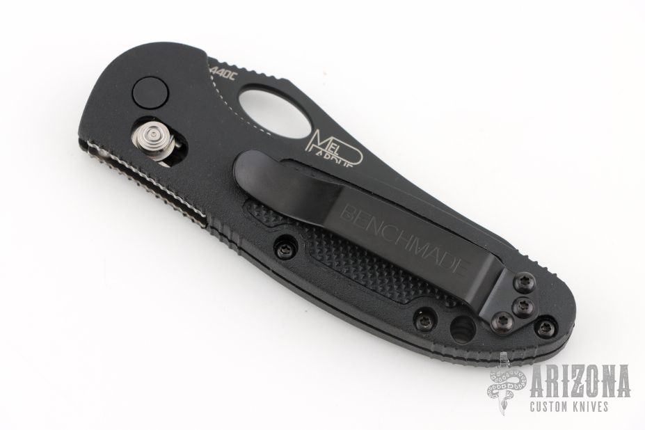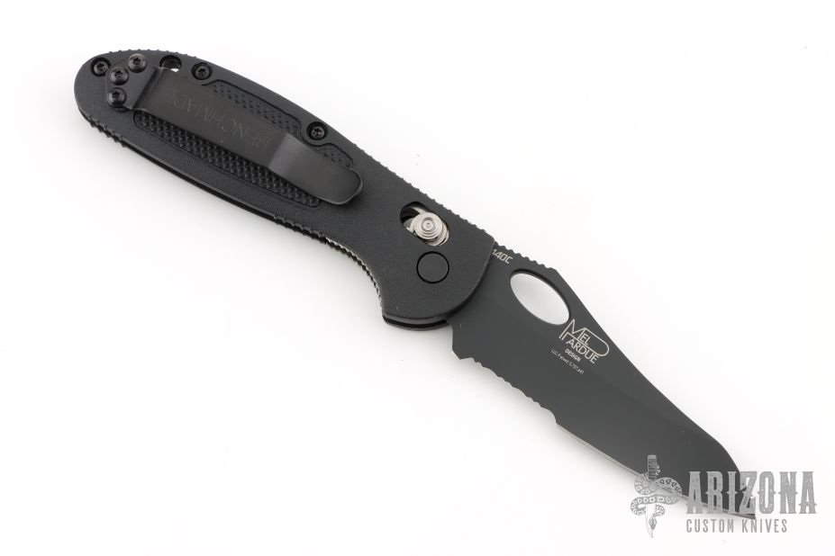 This Mel Pardue design by Benchmade has a black partially serrated blade with notched thumbrest and thumbhole. Axis lock mechanism. The handle has black FRN scales, stainless steel liners and tip up reversible clip. Includes original packaging. Excellent condition.
