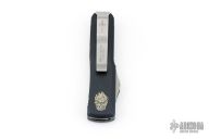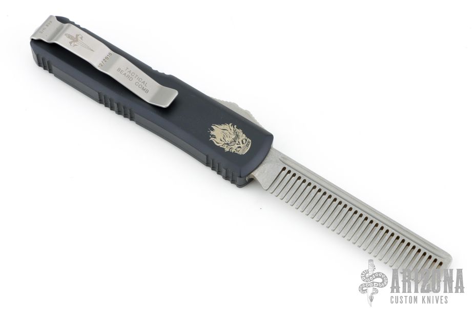 This UTX-85 OTF automatic Tactical Beard Comb by Marfione Custom Knives features a fine tooth hand ground stonewashed comb blade, and a black aluminum handle with tip down bead blasted stainless steel clip. Serial number 899 and dated 12/2018. Comes with original box, metal COA, zipper case, and drawstring pouch. Has a couple light scuffs, otherwise Excellent condition. Has a screw holding the clip in place, does come with the glass breaker.