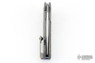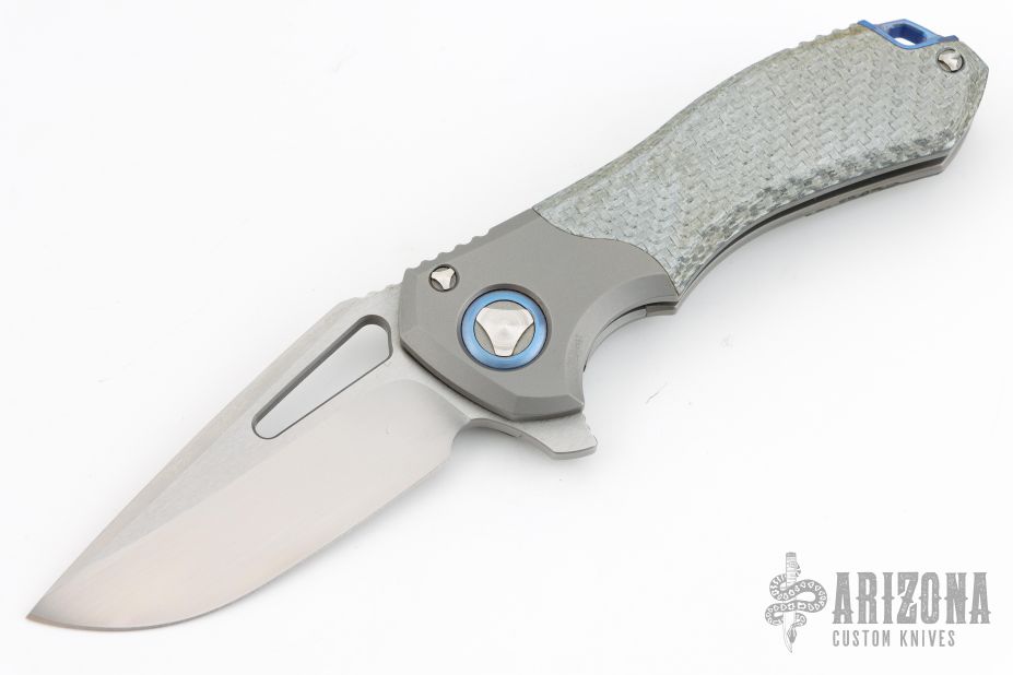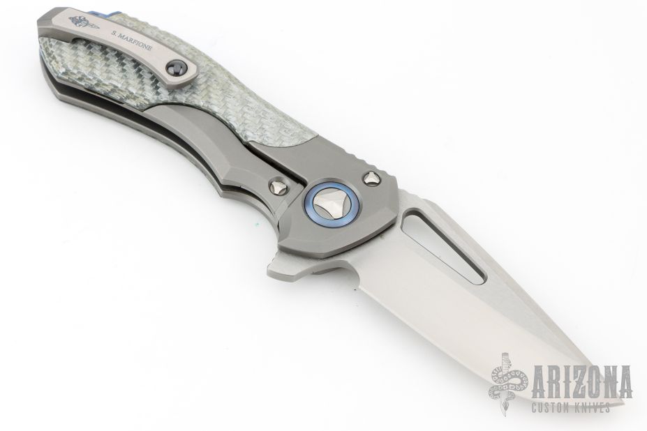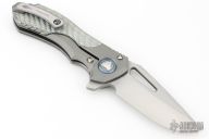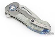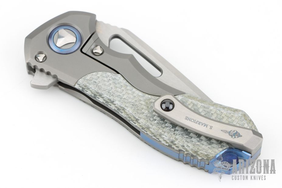 This Protocol Flipper by Marfione Custom Knives features a hand rub satin finished blade with notched thumbrest and flipper. The handle has a double vapor blasted titanium frame with silver twill carbon fiber scales, blue anodized titanium backspacer and hardware, tip up titanium clip with ceramic ball and hidden screws. Nice detent, lockup and blade seating. Comes with original box, metal COA, zipper case, drawstring pouch and cleaning cloth. #025 and dated 04/2020. Excellent condition.