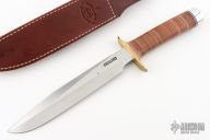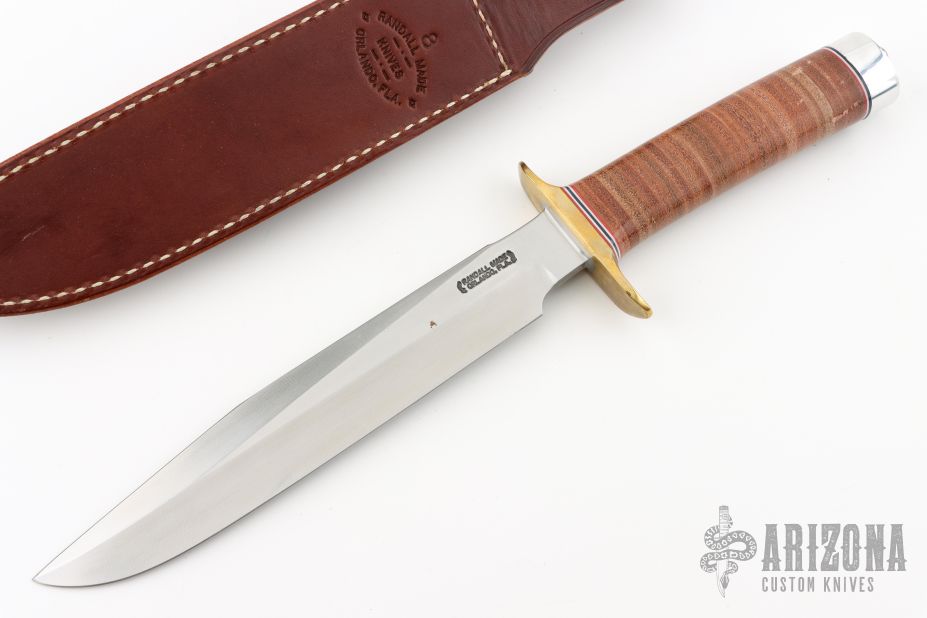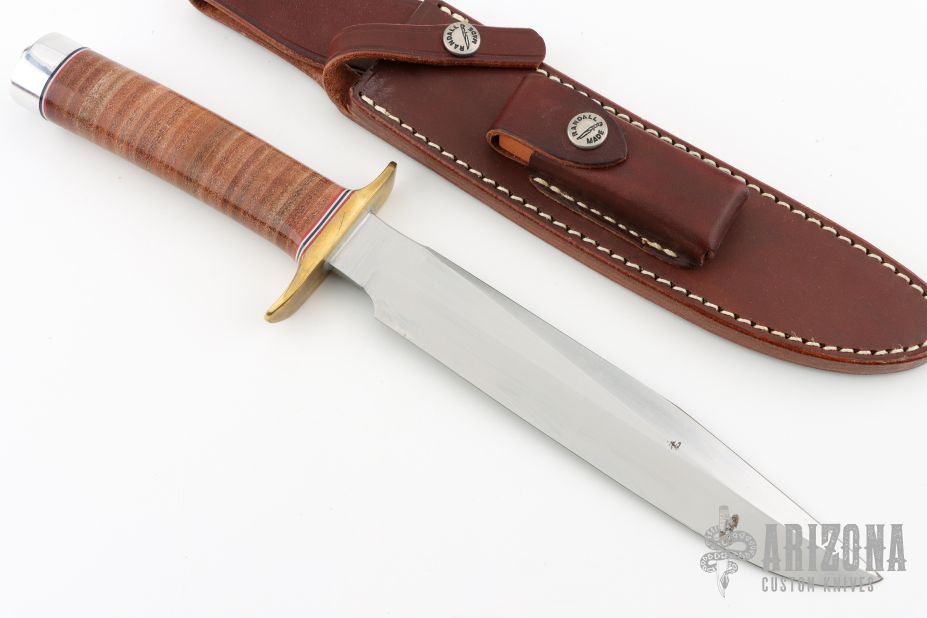 "The Model 1 by Randall Made Knives was made famous by Allied combat troops in World War II and has since been widely used in all theaters of war." This knife features a satin finished blade with a sharpened top edge, .211" blade stock and 1.283" blade depth, hidden tang construction. Brass guard, stacked leather handle with red/white/blue spacers, and a duralumin butt cap. Includes a brown leather sheath and original paper wrapping. Has a couple oxidation spots on the blade, otherwise excellent condition.