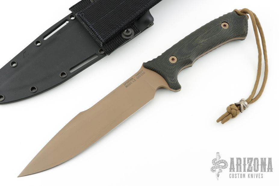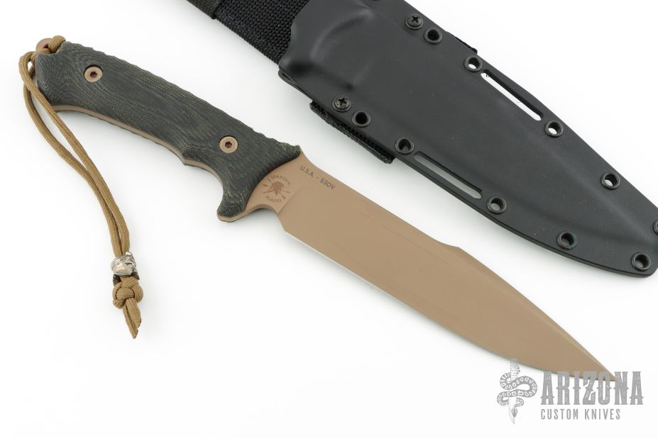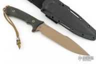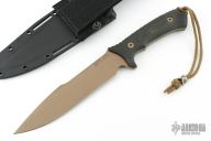 This Spartan-Harsey from Spartan Blades features a flat dark earth coated clip point blade with false top edge, .187" blade stock and 1.560" blade depth, full tang construction. The handle has black canvas micarta scales with notched thumb ramp and exposed tang pommel and lanyard hole with lanyard. Includes Kydex sheath with nylon belt loop. Has some very light sheath scuffs, otherwise excellent conditon.
