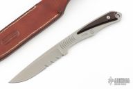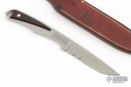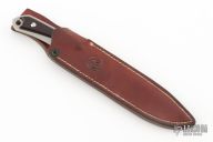 "Small enough for convenient carry but large enough to do substantial work, the Inyoni combines function with elegance, hi-tech with tradition. Inyoni is the Zulu word for “bird” and the slim blade works easily with birds, fish and small game. The blade is stonewashed and partially serrated, .128" blade stock and .827" blade depth, full tang construction with cocobolo scales. Comes with a brown leather sheath. Excellent condition.