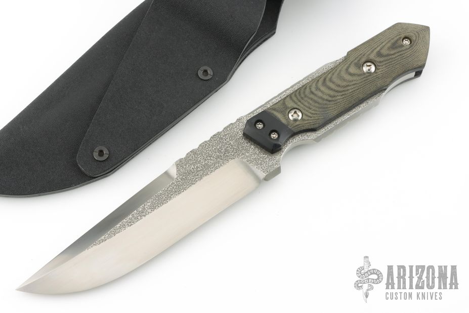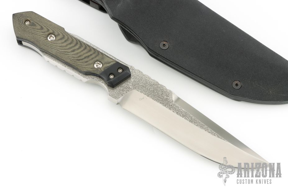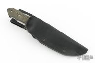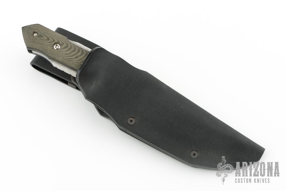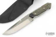 This knife from Kazutoshi Tanabe of Silver Spoon Knives features a hand rub satin finished blade with false top edge and notched thumbrest, .254" blade stock and 1.505" blade depth, full tang construction. The handle has black G10 bolsters, black/green linen micarta scales, blue G-10 and carbon fiber liners. The tang is undercut and there is a lanyard pin in the butt of the handle. Includes leather lined kydex sheath. Excellent condition.