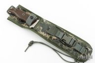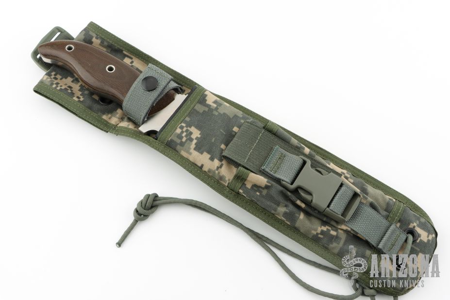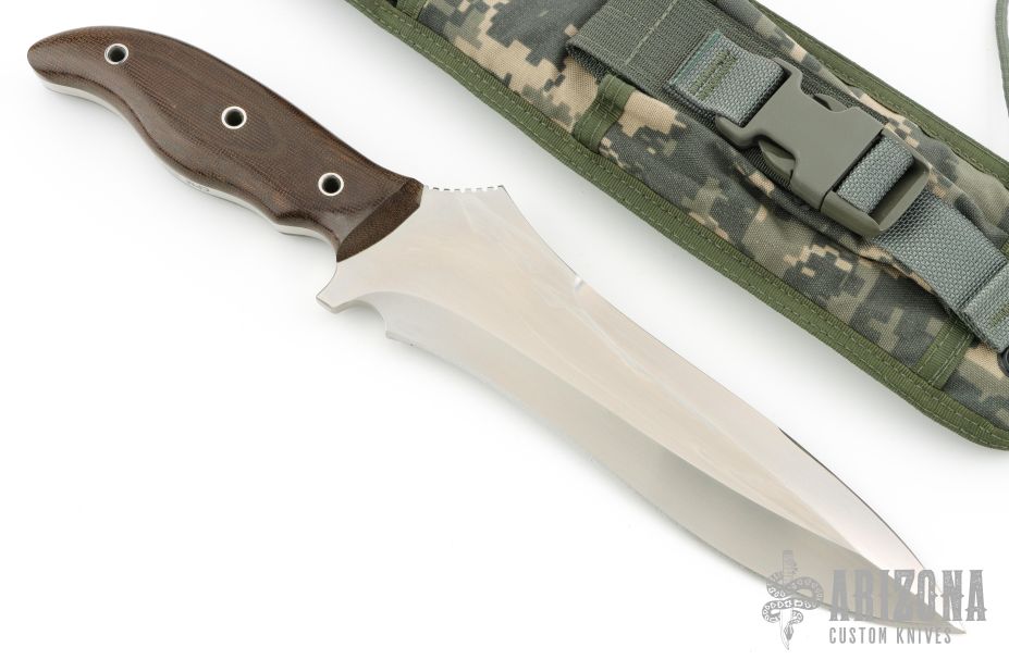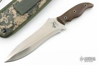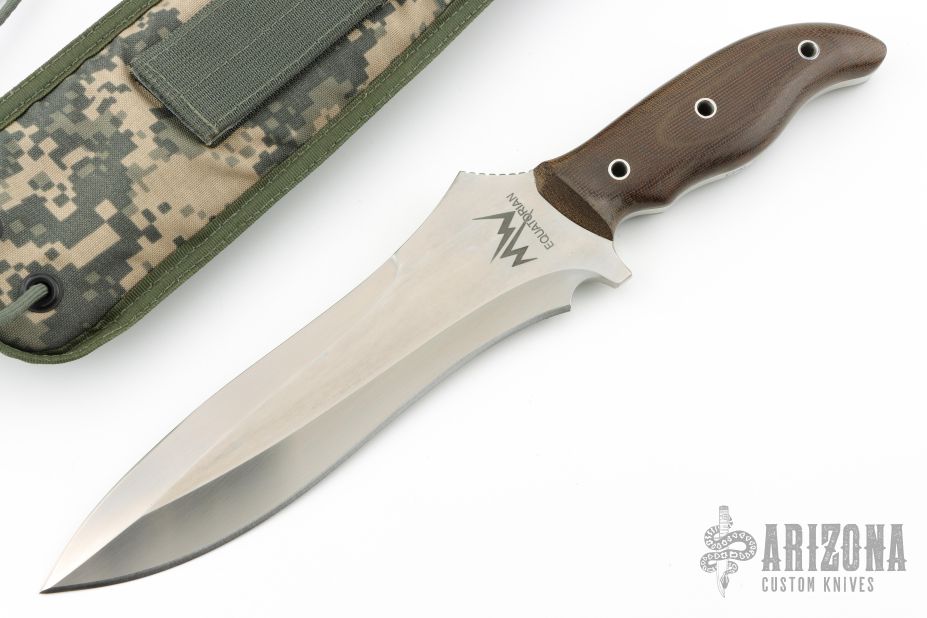 This Equatorian from Mercworx features a hand rub satin finished spear point recurve blade with sharpened top edge and notched thumbramp, .242" blade stock and 2.521" blade depth, full tang construction. The handle has brown canvas micarta scales. Includes a nylon/kydex sheath. Excellent condition.