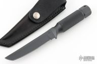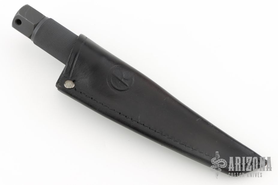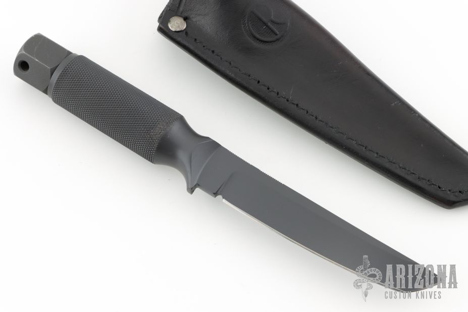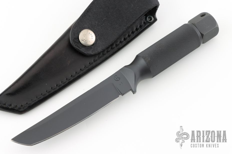 This Tanto III from Chris Reeve features a black coated tanto style blade. The handle is comprised of integrally constructed A2 steel with a hollow handle and removable aluminum pommel. Includes a replacement black leather sheath with belt loop. Has a couple light scuffs, otherwise excellent condition.