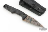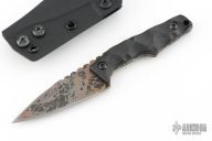 This Muninn Dagger by Bawidamann Blades was named after Odin’s Raven. It features a bronze patina acid etched blade with notched thumbrest and sharpened top edge, .100" blade stock and 1.085" blade depth, full tang construction. The handle has IM Bawidamann Chunked Pattern Carbon Fiber scales (proprietary Carbon fiber composite). Comes ready to carry with the Bawidamann Uberscabbard. Excellent condition.