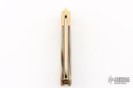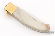 This Lever release features a mirror polished blade. The handle has brass bolsters, honey horn scales, brass liners and stainless steel backspacer. Has brass lever. Great function! Made by Igor Rodini. Excellent Condition.