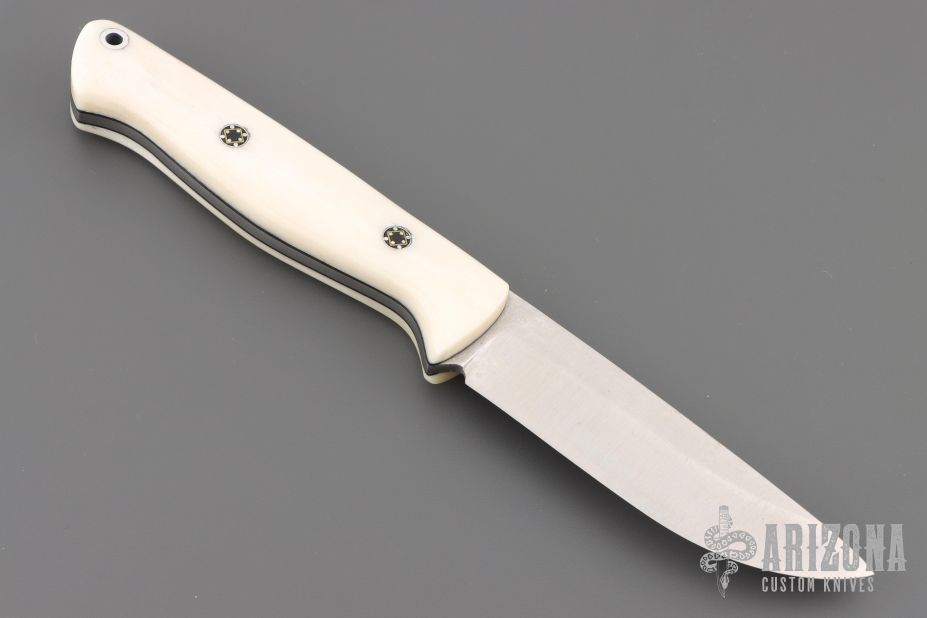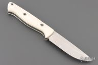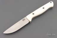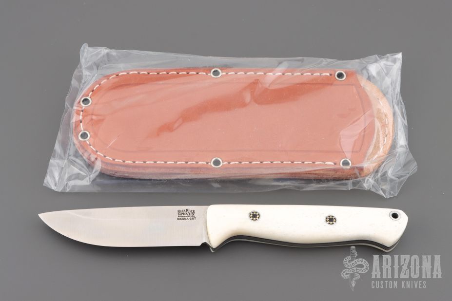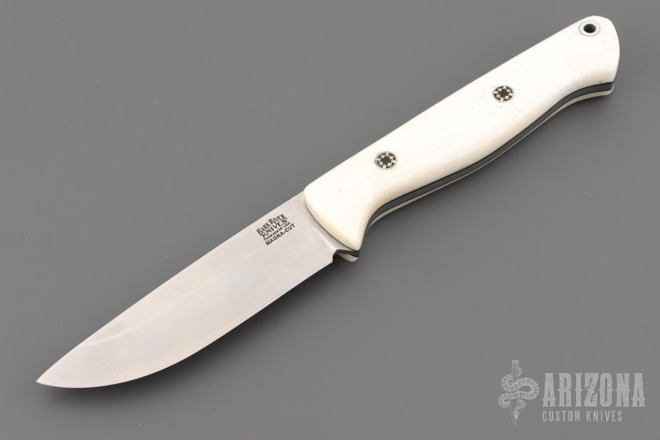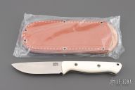 This Gunny Hunter LT by Bark River Knives features a satin finished blade with .129" blade stock and .975" blade depth, full tang construction. The handle has smooth bone scales with mosaic pins and lanyard hole. Comes with original box, and brown leather sheath. Excellent condition.