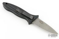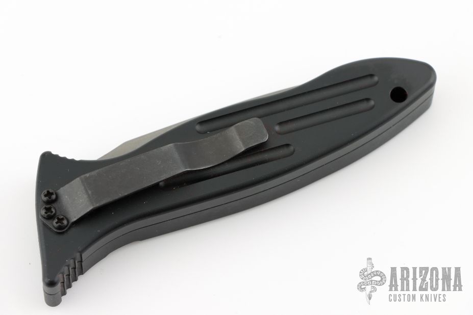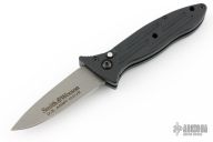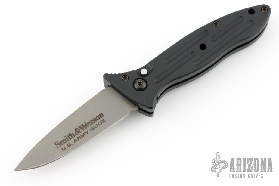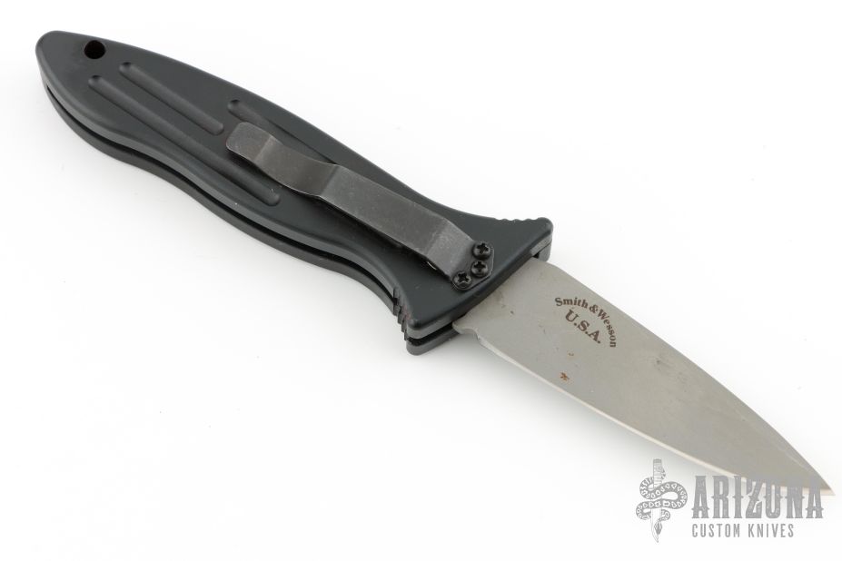 This auto from Smith & Wesson has a bead blasted drop point blade with false top edge. Black aluminum handle. Tip down Stainless steel pocket clip. Comes with original box. Excellent Condition.