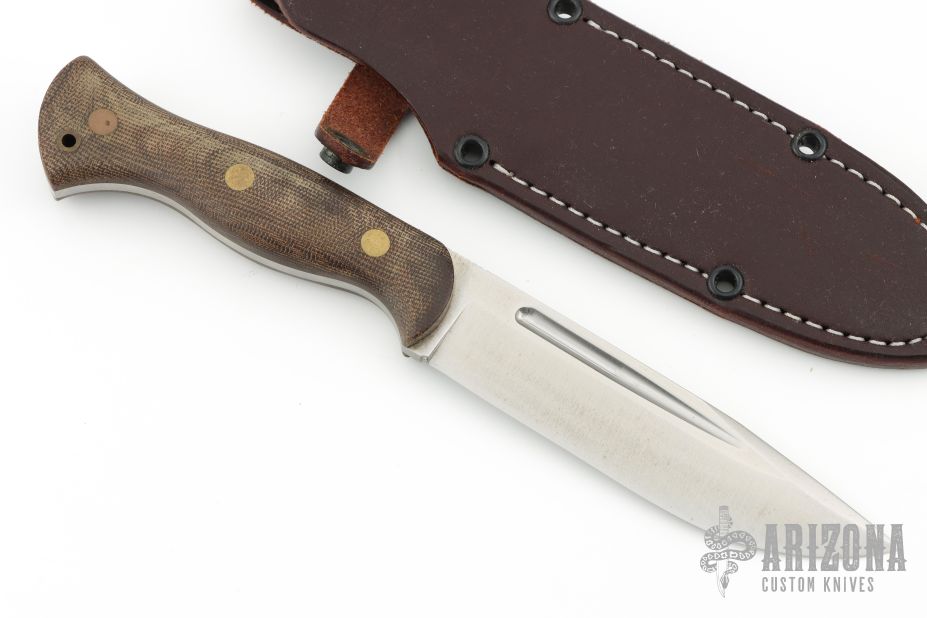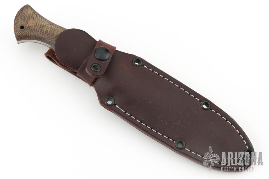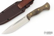This Cub by Bark River Knives features a satin finished blade with a notched thumbrest and fullers, .191" blade and 1.237" blade depth, full tang construction. The handle has green canvas micarta scales with brass pins. Comes with a brown leather sheath and original box. Excellent condition.