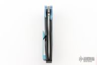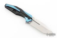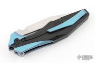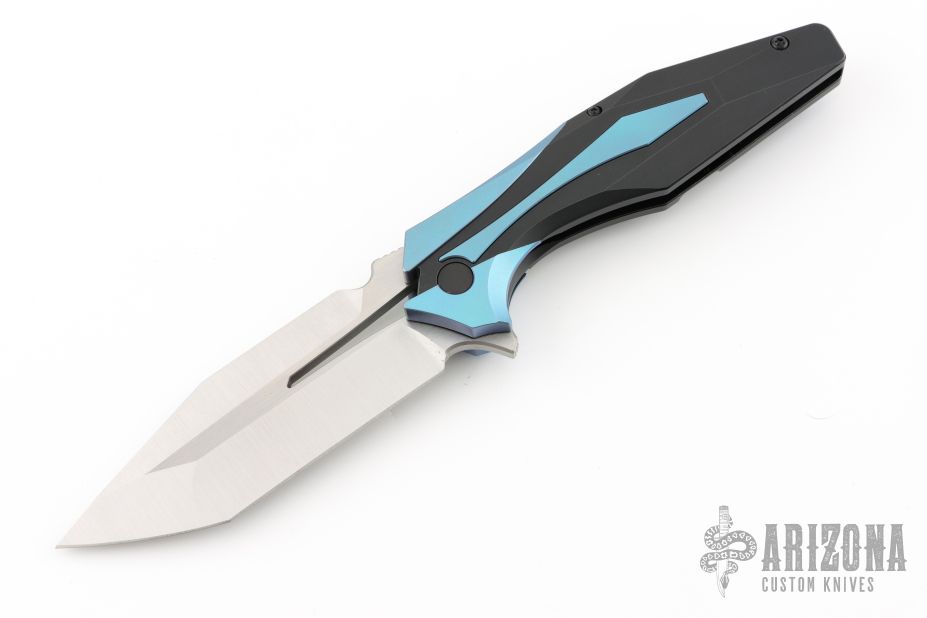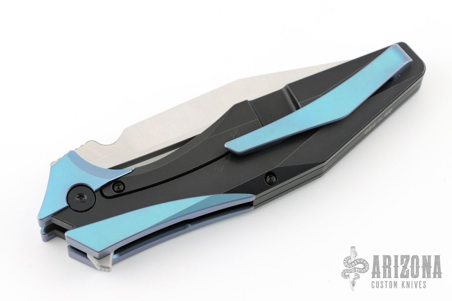 This one has a satin finished blade with notched thumbrest and flipper. the handle has a black titanium frame with anodized titanium accents, comes with original anodized titanium accents. Comes with original box, zippered case and COA dated 12-1-23. Excellent condition.