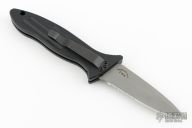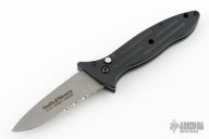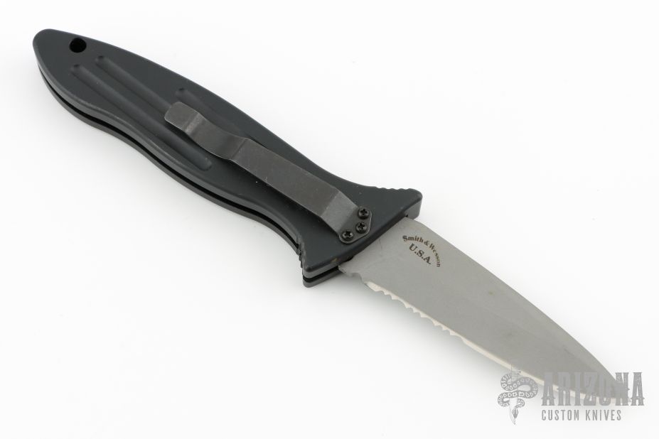 This auto from Smith & Wesson has a drop point partially serrated blade with false top edge. Black aluminum handle. Tip down Stainless steel pocket clip. Comes with original box and papers. Has some scuffs otherwise excellent condition.