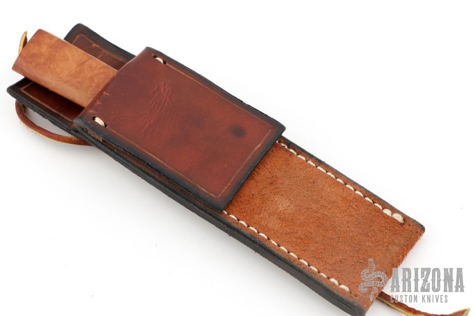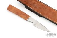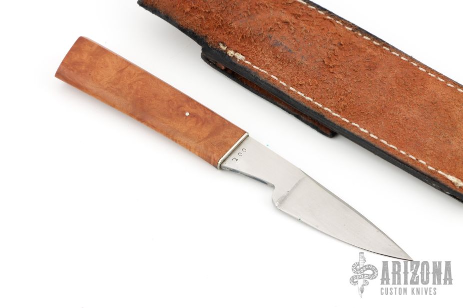 This knife by Lee Reeves features a hand rub satin finished blade with .118" blade stock and .781" blade depth, hidden tang construction. The handle has a nickel silver guard and curly maple burl grip. Comes with a leather sheath. #100 on the blade. Has a few light scratches and some patina, otherwise excellent condition.