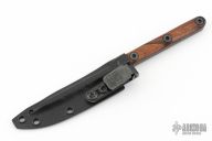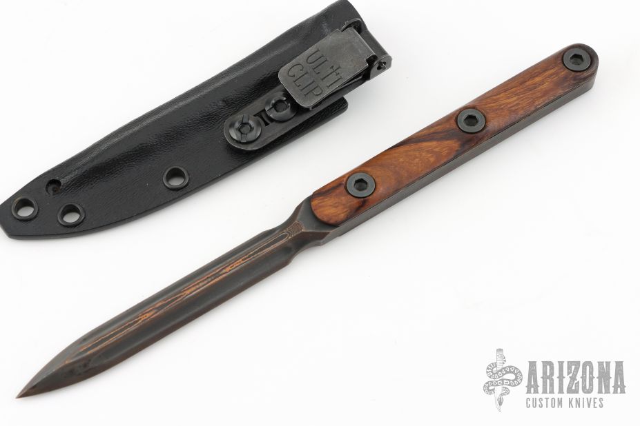This Spike by Half Face blades. Has a chisel ground Baker Forge CuMai Damascus blade with fullers, .236" blade stock and .556" blade depth, full tang construction. The handle has sculpted ironwood scales. Comes with kydex sheath with ulti-clip and original box. Excellent Condition.