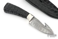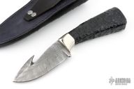 This fixed blade by Jim Ort features a Damascus blade with guthook, .162" blade stock and 1. 442" blade depth, hidden tang construction. The handle has a nickel silver collar, and leather grip. Comes with a leather belt sheath. Excellent condition.